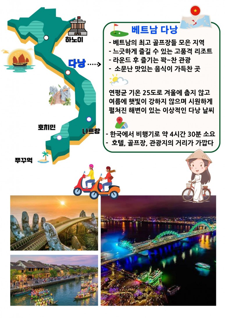 | 다낭 | 호텔 조식 후 체크아웃 골프장 이동 남호이안 CC 18 홀 라운딩 라운딩후 호텔의 부대시설 이용 및 자유시간 공항으로 이동 |