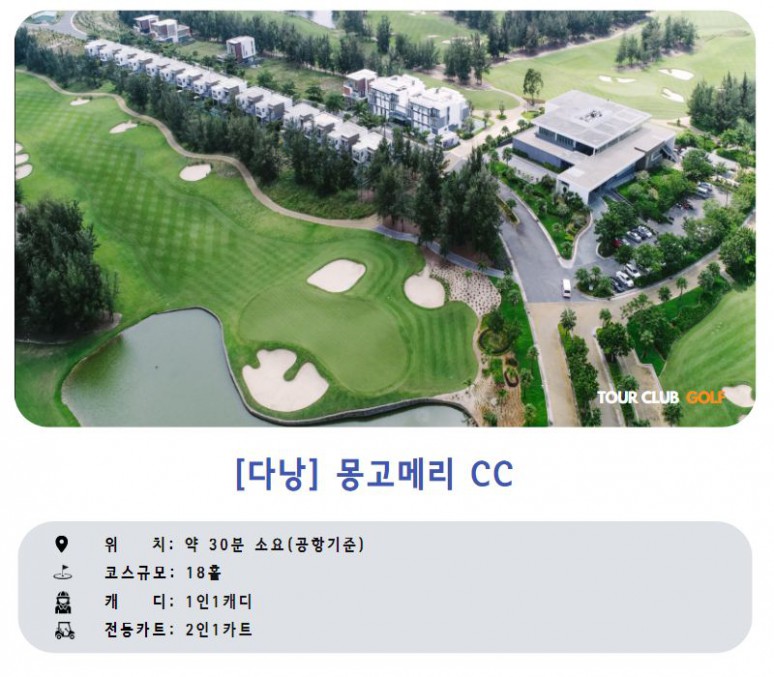 | 다낭 | 호텔조식후 가이드 미팅후 골프장으로 이동 빈펄 남호이안 CC / 호이아나 CC / 바나힐 CC / 몽고메리 CC 중 1곳 18홀 라운딩 라운딩 후 쇼핑센터 방문 2회 (노니/커피/잡화 중) 손짜반도 관광 베트남 최대의 불상 해수관음상이 있는 영응사 관광 석식(개별지불)후 공항으로 이동 |