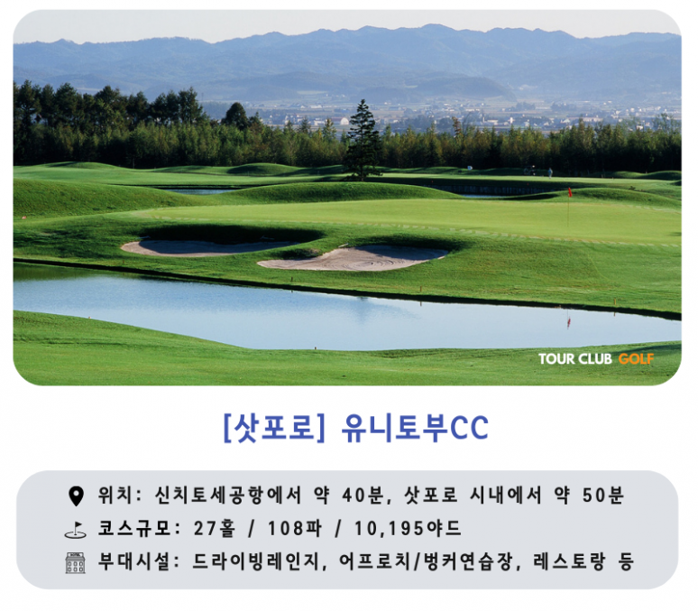 - 유니토부CC : 일본 코스 설계 장인 고바야시 미츠아키의 도전적인 철학이 담긴 27홀 코스로 북해도 베스트 10에 선정된 바 있습니다.