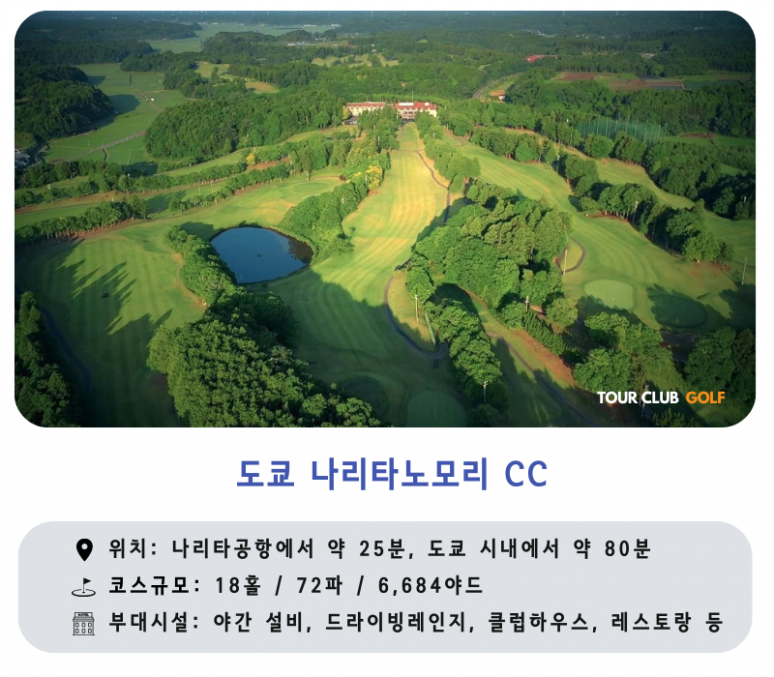 - 나리타노모리CC : '나리타의 숲'이라는 골프장 이름에서 알 수 있듯이 녹음이 우거진 숲이 아름다운 명문 골프클럽입니다. 나리타 공항에서 25분 거리의 최적의 위치와 라이트 시설 완비로 많은 골퍼들의 사랑을 받고 있습니다.