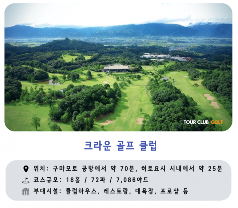 - 크라운GC : 일본 프로 골프 명예의 전당(레전드 부문)에 오른 스미모토 히데요 프로가 감수한 크라운GC는 구마모토현의 각종 대회 유치로 이름을 떨치는 골프장입니다.?