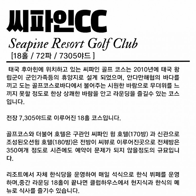 | 호텔 조식 후 ▶블랙마운틴 ,반얀,씨파인CC 중에서 1곳 18홀 라운딩 자유석식 후 수완나폼 공항으로 이동 |