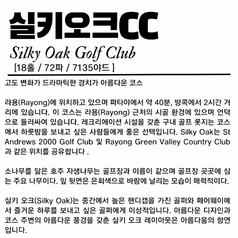 | 파타야 | 전일 | 호텔 조식 후, 골프장으로 이동 파타비아아 CC .그린우드CC.실키오크CC 中 18홀 라운딩 자유일정 및 석식 후, 호텔 투숙 및 휴식 |