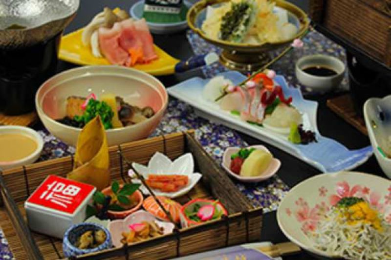 유아사의 명물인 유아사 간장과 긴잔지 된장으로 맛을 낸 가이세키 요리를 즐기실 수 있습니다.