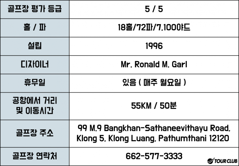 평평한 논 위에 건설된 골프코스는 언덕과 함께 코스의 기복을 만들어 놓았고, 이로 인해 방콕 근교에서는 유일하게 인공적으로 조성된 챔피온쉽 골프코스로 유명합니다.
