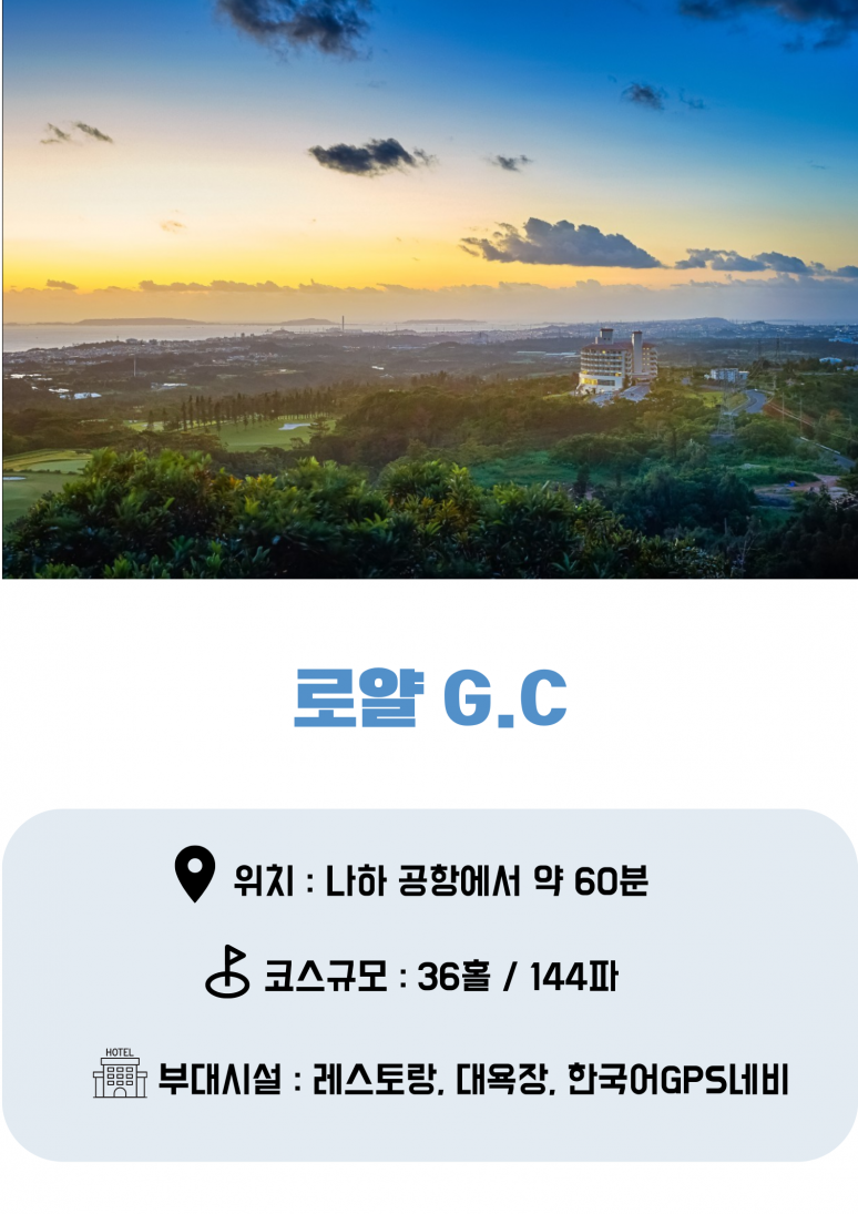 | 오키나와 | 호텔 조식 후 골프장 이동(약 4분) ▶오키나와 로얄 G.C 18홀 (셀프+카트) 호텔 복귀 후 석식 |