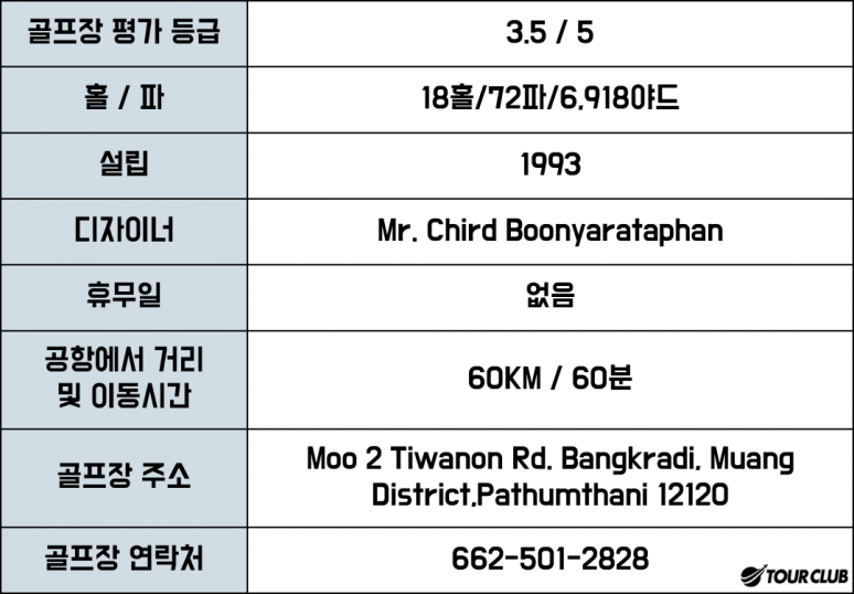잘 가꿔진 페어웨이와 훌륭한 그린으로 많은 방콕 골퍼들에게 사랑받는 골프장이며 야간 골프 시설이 있어 방콕의 뜨거운 태양을 피해 신선한 저녁에 골프를 즐길 수 있다는 장점이 있습니다.그리고 골프장 내에 펠리컨, 오리 그리고 노루 등이 뛰노는 모습을 보는 것도 또 하나의 즐거움입니다.