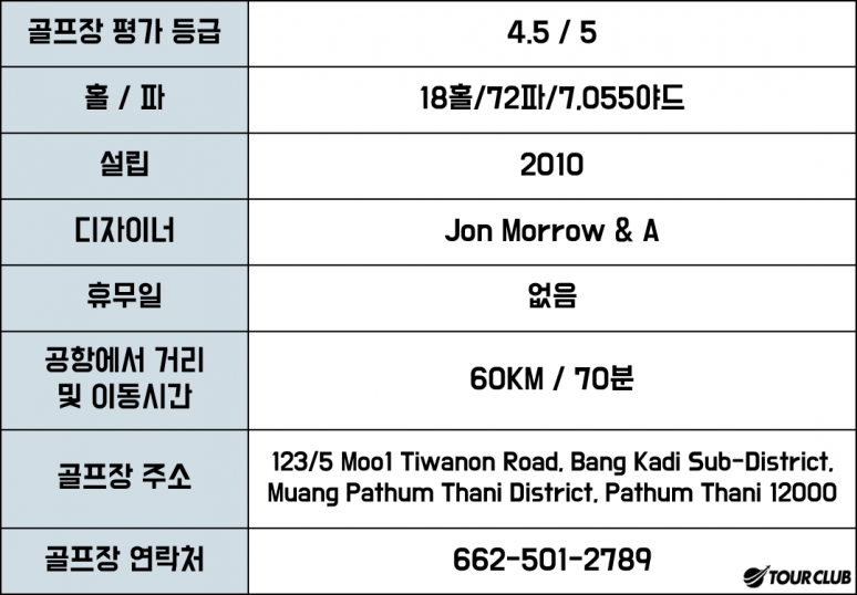 골프장의 레이아웃이 아기자기하여 평범한 곳을 싫어하시는 분들에게는 또 다른 방콕 근교의 상급 골프장으로 추천해 드릴만 한 곳입니다.또한 15번 홀 파3홀에서 180야드 그린과 100야드 남짓의 아일랜드 그린 중 원하시는 그린을 선택하여 라운딩 할 수 있어 편한 골프장입니다.