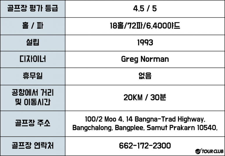 Greg Norman이 디자인한 7,008야드, 파 72 코스는 아름답게 조경된 주변 환경에 자리잡고 있으며 빠른 그린, 전략적으로 배치된 벙커, 자연 호수 및 하천을 갖추고 있습니다. 배수가 잘되어 일년 내내 놀 수 있습니다.