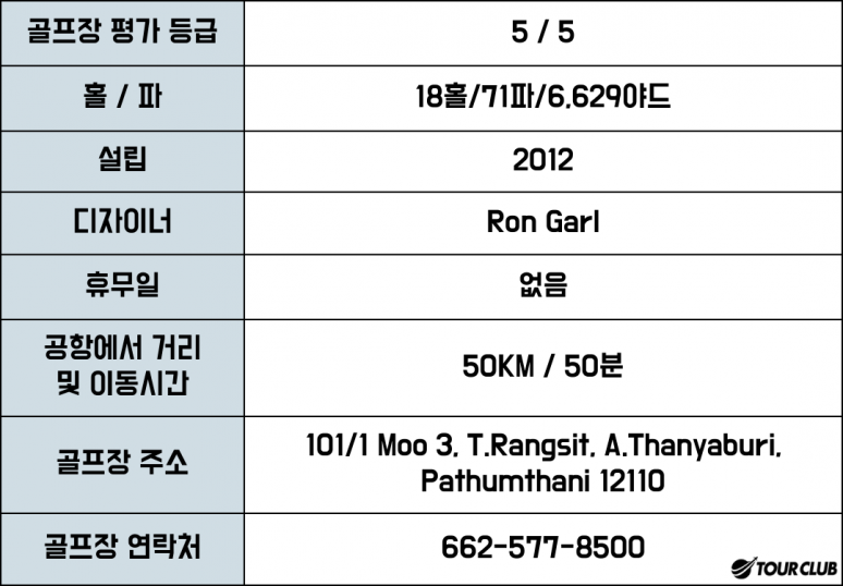 타이 컨트리 클럽이나 알파인 같은 유명세는 아직까지는 없지만 점점 더 많은 골퍼들에게 알려지면서 방콕의 10대 명문 골프장으로 자리를 잡아가는 중입니다.페어웨이나 그린은 관리가 아주 잘 되어 있으며, 그린상태가 훌륭한 것으로 정평이 나 있어 라운딩 환경 또한 훌륭합니다.