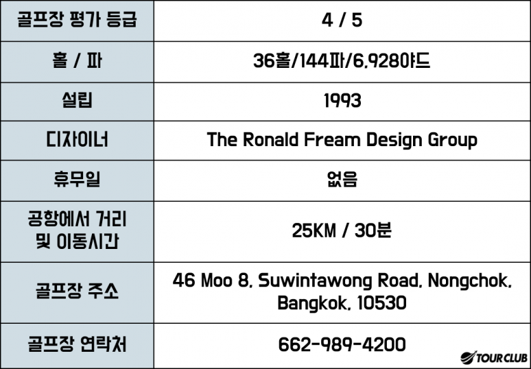 A Course(Lagoon), B Course(Palm), C Course(Garden), 코스이었으나 현재는 추가로 D Course(Lakeside)로 조성되어 총 36홀(Par144 / 13,815 yards) 규모를 자랑합니다.