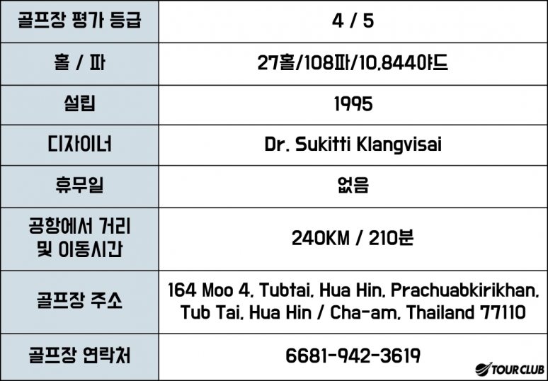 이 27홀 골프장은 그림 같은 야자수가 늘어선 기복이 심한 페어웨이가 특징으로 매우 열대적인 느낌을 줍니다. 푸켓의 Loch Palm Golf Club도 설계한 실력파 Dr. Sukitti Klangvisai가 설계한 이 코스는 잘 펼쳐져 있으며 772야드의 태국 최장 파5가 특징입니다. 페어웨이가 넓어서 인접한 페어웨이에서 다른 선수들을 보는 것은 거의 불가능합니다.원래 정글을 가로질러 땅의 자연적인 윤곽을 따르고, 이 녹음이 우거진 풍경은 후아힌의 다른 몇몇 코스들만큼 잘 다듬어져 있지 않을 수도 있지만, 그럼에도 불구하고 사랑스럽고 자연스러운 느낌을 줍니다. 대부분의 홀은 워터해저드의 위험이 있을 뿐만 아니라 정확한 샷에 보상을 주는 훌륭한 벙커링을 가지고 있습니다.