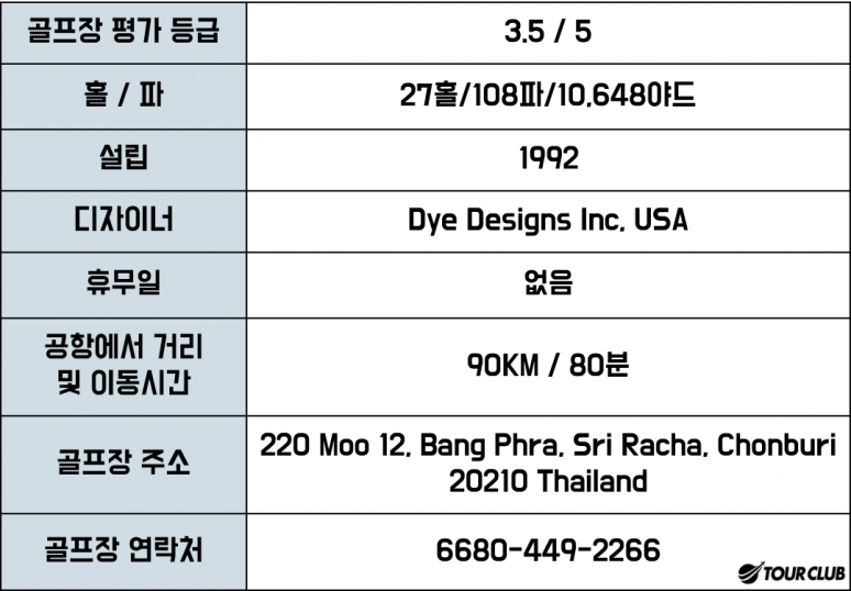 수많은 워터 해저드와 포트 벙커는 매우 즐거운 코스를 만드는 데 도움이 됩니다. 자연석과 유리로 지어진 아름다운 클럽하우스가 주변 환경을 완성합니다.
