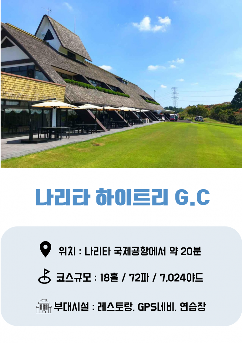 | 나리타 | 호텔 조식 후 골프장 이동 나리타 하이트리 / 태평양 클럽 나리타 코스 / 타이에 컨트리 나리타 골프클럽 / 나리타 힐즈 또는 동급 코스 18홀 라운딩 호텔 귀환 후 석식 / 자유시간 |
