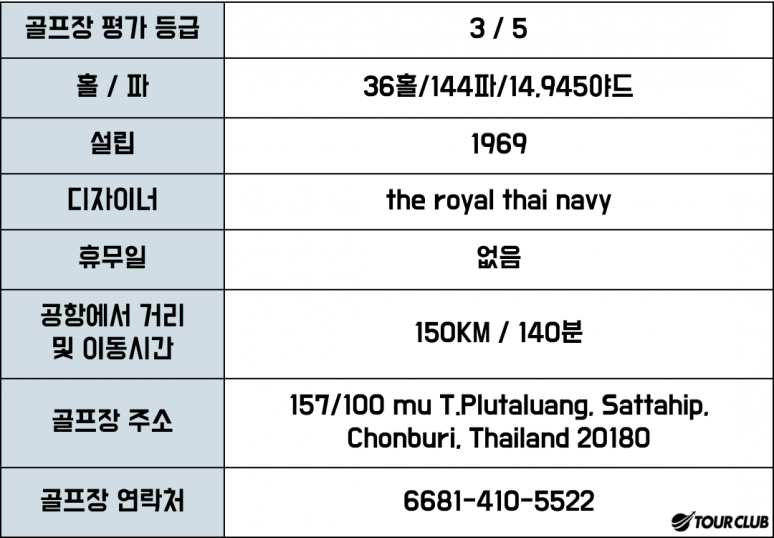 The Royal Thai Navy가 디자인 했으며 1969년에 개장한 36 Holes - Par 144 14945 yards로서 해군이 관리하는 골프장으로 4개 코스(T North, The South, West and East courses)로 되어 있습니다.