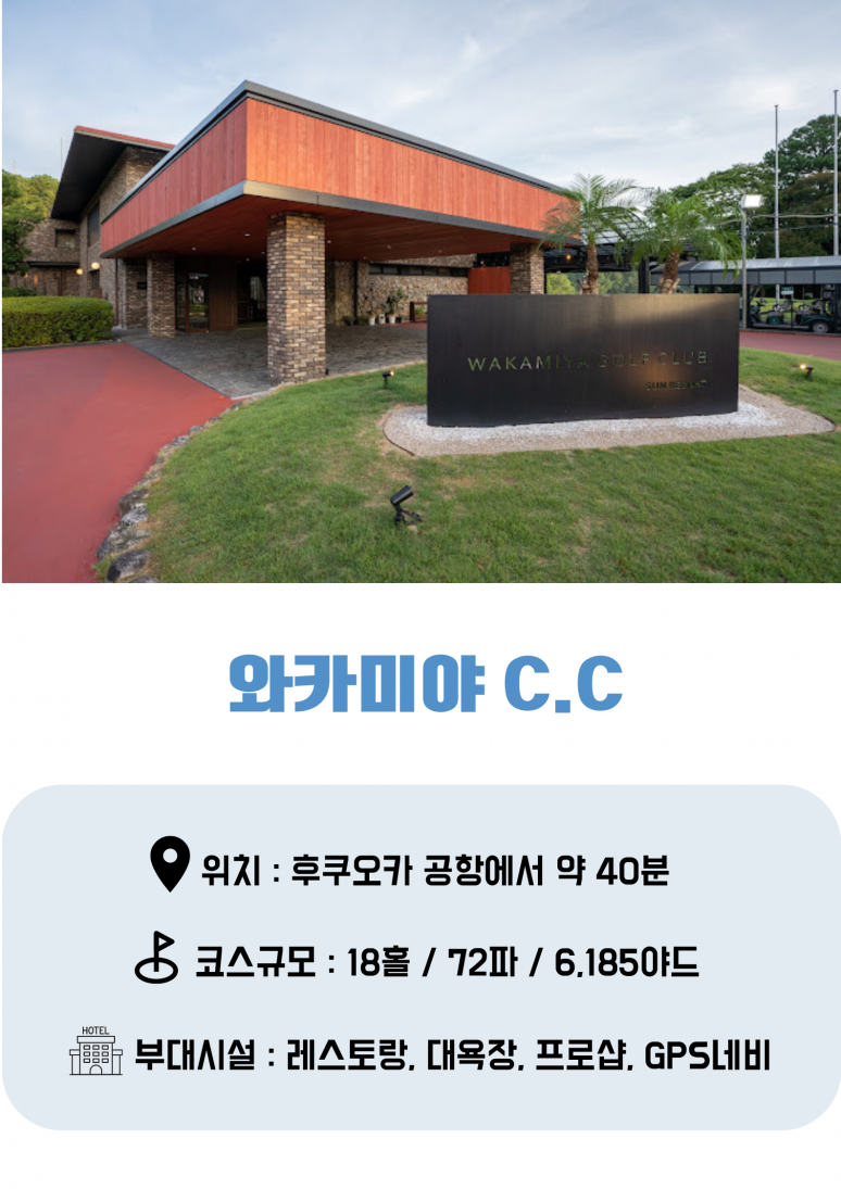 부산 김해공항 출발 후쿠오카 공항 도착 송영차량 미팅 후 골프장 이동 선골프&리조트ㅡ 와카미야CC 18홀 라운딩(카트+셀프플레이/일몰 시 까지) 라운딩 후 호텔 체크인 및 자유시간 |