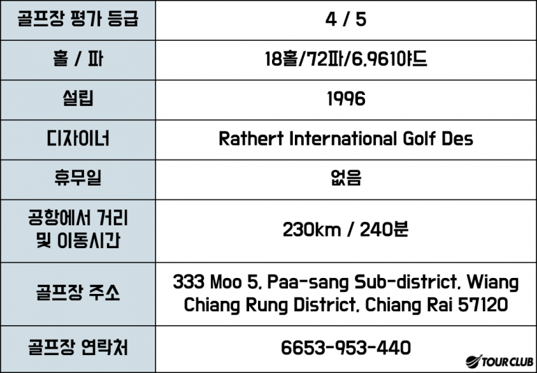 18홀의 워터포드 벨리 치앙라이 골프 코스는 겨울에 가장 쌀쌀한 지역으로 태국에서 가장 매력적인 지역 중의 한 곳인 치앙라이의 도시로 부터 대략 40분의 거리에 자리를 하고 있습니다.