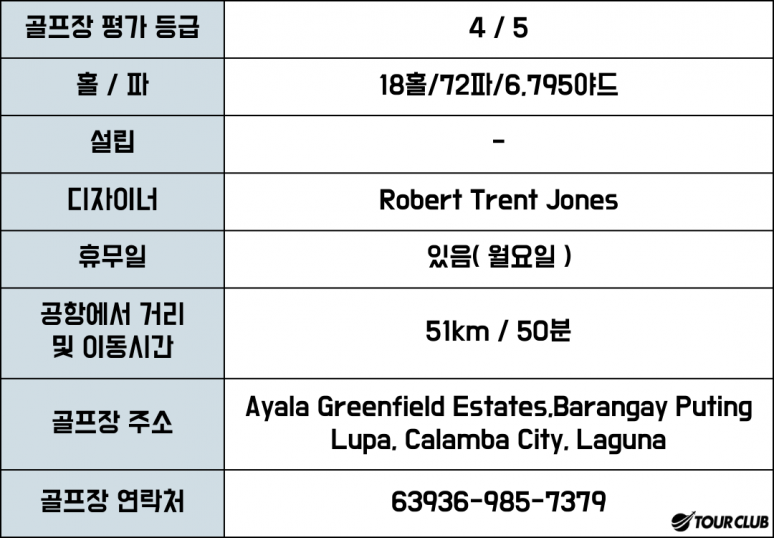 전반 9홀은 마킬링산 중턱의 울창한 숲을 한 눈에 담으며 라운딩을 즐길 수 있습니다. 후반 9홀은 수풀로 덮힌 언덕의 경사면과 나무로 가려진 강, 검은 화산석으로 이루어진 언덕이 양옆으로 펼쳐져있어 아름다운 경치를 즐기며 지루하지 않은 라운딩을 즐길 수 있으며, 전장은 조금 짧은편이지만, 아기자기하고 명성에 걸맞는 훌륭한 관리를 받고 있습니다. 페어웨이는 전반적으로 평평하며 벙커와 워터해저드가 다수 있어 정확하고 전략적인 샷을 요구합니다.?