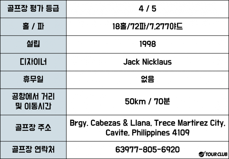 셔우드 힐스 골프장은 넓은 페어웨이를 자랑하고 있고 나무나 주위의 환경은 한적한 편이나 플레이를 하기에는 많은 재미를 느낄 수 있는 코스입니다. 필리핀의 지리적 요건을 잘 이용하여 설계되었으며, PAR3 6번홀은 시야 확보가 잘되어 많은 사람들이 홀인원을 노리는 곳이며, 12번홀과, 18번홀은 가장 어려운 그린으로 골퍼들에게는 다소 어려울 수 있습니다. 페어웨이나 그린도 잘 가꾸어져 있어 한국인들이 플레이하기 가장 적합하고, 편안한 코스입니다.?