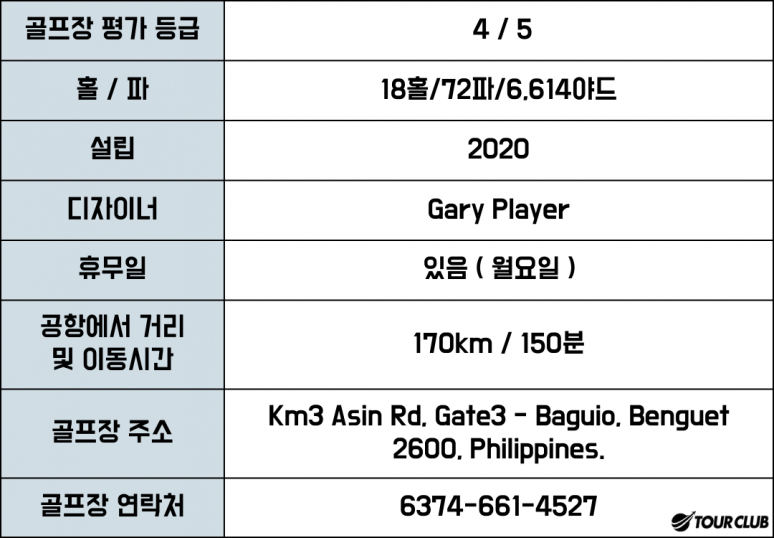 바기오시 전체가 한 눈에 내려다 보이는 산 정상에 골프코스를 건설하여 눈이 즐거운 라운드를 즐길 수 있다.