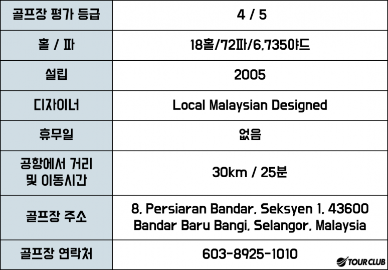 18홀 파72 코스에는 다른 말레이시아 골프 코스와 마찬가지로 카우 그래스 페어웨이가 있습니다. 그러나 그린 표면은 왜소한 버뮤다 잔디로 덮여 있고 수상 경력이 있는 Saujana Golf & Country Club을 관리하는 동일한 팀에서 관리하고 있기 때문에 평소보다 더 좋습니다. 빠른 그린 속도와 미묘하게 기복이 있는 넓은 표면이 결합되어 다나우에서의 퍼팅이 어려워집니다.?
