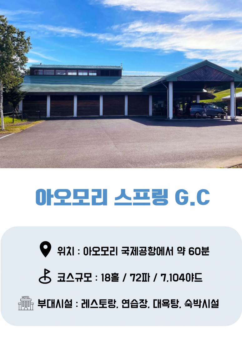 인천 국제 공항 출발 아오모리 국제공항 도착 [회사명] 미팅보드 기사미팅 후 호텔이동(약 60분) 캐리어는 프런트에 보관 / 차량으로 골프장 이동 (약 1분) ▶ 아오모리 스프링 골프코스 9홀 (셀프+카트) / 일몰플레이 체크인 후 레스토랑에서 식사 (뷔페식) / 온천욕 |
