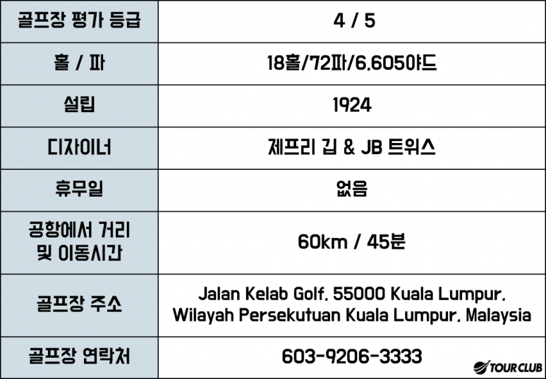6,605야드, 파72의 뉴 코스는 좁은 페어웨이와 전략적인 벙커링이 특징입니다. 나무가 늘어선 평평한 지형에서 물이 그다지 중요한 요소가 아니더라도 두 가지 모두 게임에 도전적인 운동을 제공합니다. 아마도 첫 번째 홀인 짧은 파4는 KL의 가장 유명한 건물인 페트로나스 트윈 타워(Petronas Twin Towers)로 향하는 오프닝 드라이브와 함께 다른 홀과 마찬가지로 여러분의 마음에 남을 것입니다.?