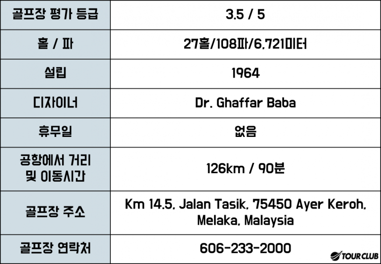 아예르 케로 컨트리클럽 루트는 매력적이고 도전적입니다. 원래 코스는 Tunku와 Ghaffar의 9로 알려진 2개의 9로 구성되었습니다. 세 번째 9개 건물(Governor's)은 1990년대 중반에 문을 열었습니다. 3개의 나인은 꽤 많은 홀에서 플레이되는 Ayer Keroh Lake로 알려진 호수를 껴안고 있습니다. 이 과정은 잘 성숙되었으며 적절한 지원과 세부 사항에 대한 관심을 통해 달성 가능한 결과를 입증합니다.