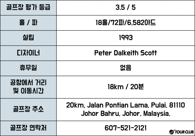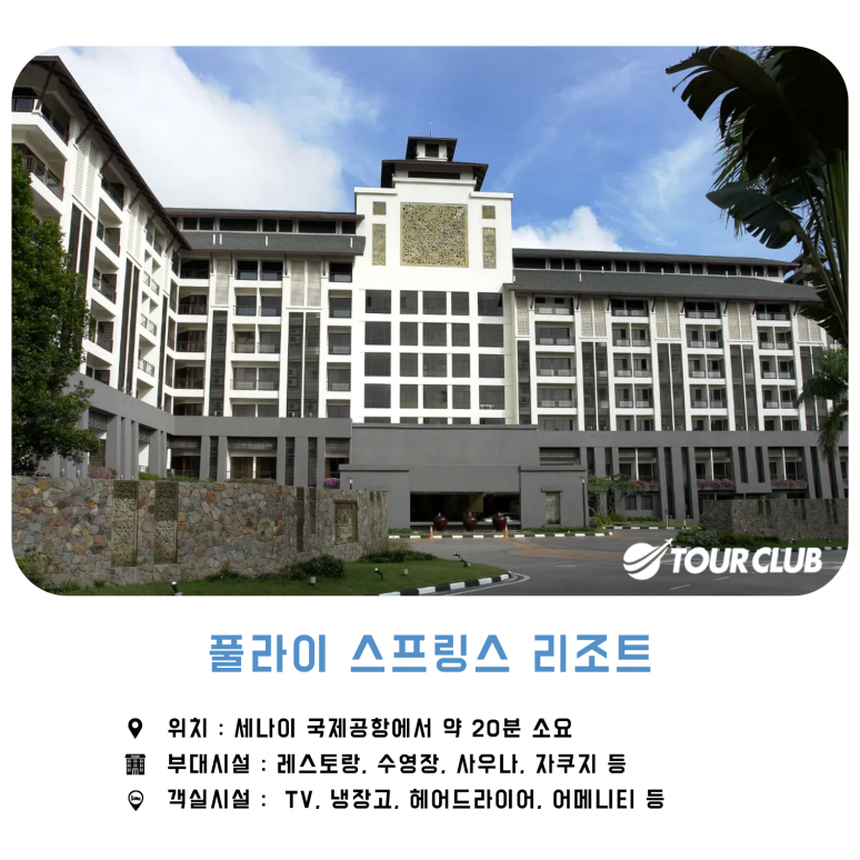 풀라이 산 ??기슭에 자리잡은 풀라이 스프링스 리조트( Pulai Springs Resort) 는 숨막히는 자연 경관과 구불구불한 녹지와 기복이 심한 언덕의 탁 트인 전경을 자랑합니다. 풀라이 스프링스 리조트에는 2개의 챔피언십 골프 코스가 있으며 한때 세계 50대 골프 리조트 중 하나로 선정되었습니다. 풀라이 스프링스 클럽하우스 디자인은 고대 말레이 왕궁과 유사합니다. 둥근 지붕, 노출된 목재 구조, 전통적인 모티프의 독창적인 사용은 인테리어 디자인의 전통적인 우아함을 반영합니다. 정교하게 조각된 나무와 돌 벽화는 절묘한 청나라 골동품과 동양의 풍부한 주제가 조화를 이루고 있습니다. 시설로는 사물함을 갖춘 별도의 남성 및 여성 탈의실, 암벽 샤워기, 자쿠지, 한증막, 사우나, 발 반사 요법 센터, 스낵과 음료를 제공하는 골퍼용 테라스 등이 있습니다. 멜라나 코스는 야간 골프를 위해 투광 조명을 갖추고 있습니다.?
