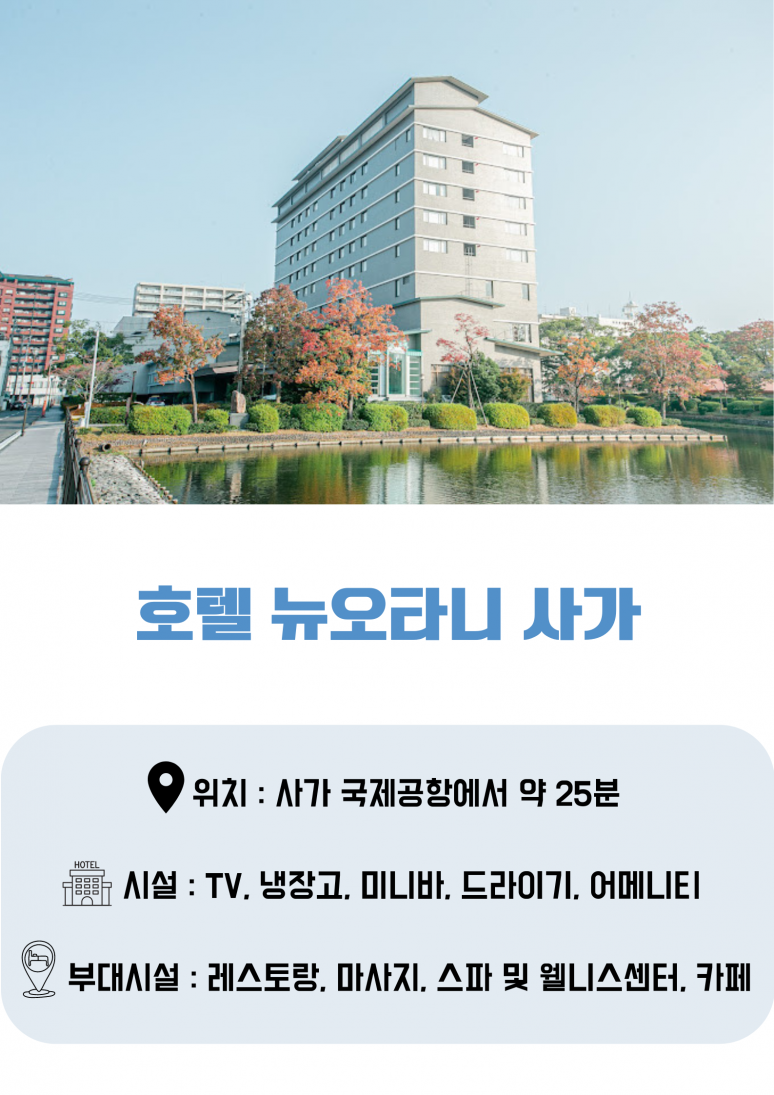 인천 국제 공항 출발 사가공항 도착 후 피켓 든 기사 미팅 숙소로 이동 및 체크인 (약 30분이동) 체크인 후 석식 및 휴식 |