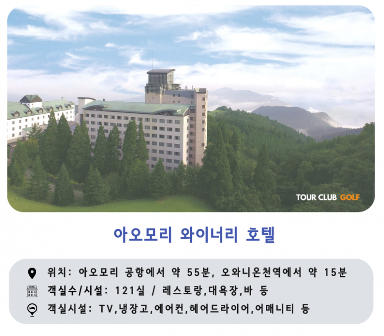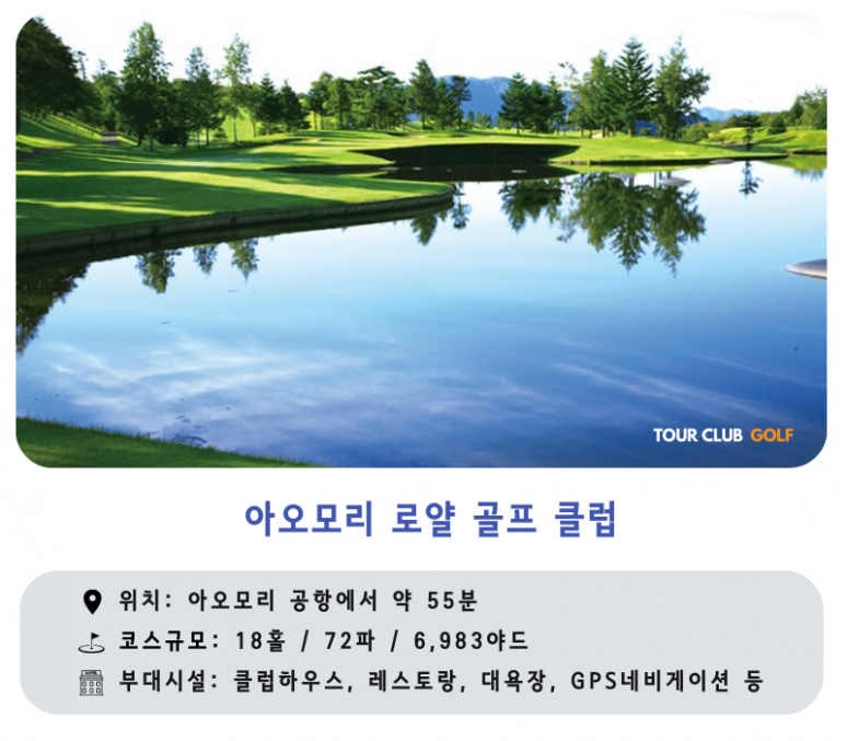 | 아오모리 | 조식 후 골프장으로 이동 (도보이동) ★ 골프 18홀+9홀 라운딩 (※ 셀프+카트 플레이) -아오모리 로얄 GC 호텔로 이동(도보이동) / 석식 후 휴식 |