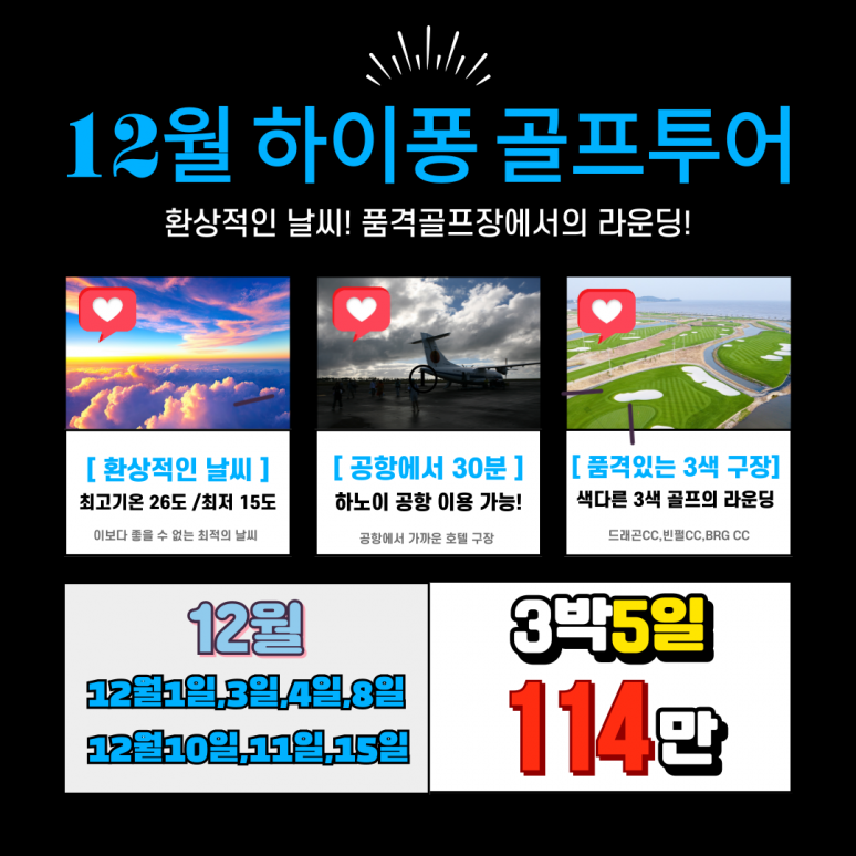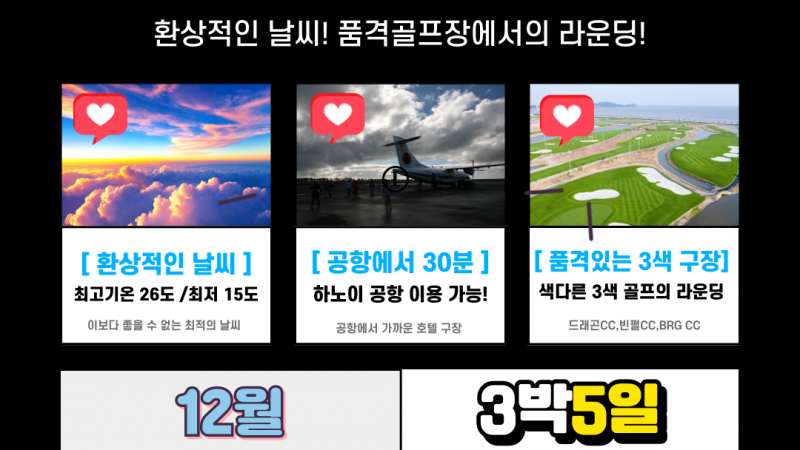 | 하이퐁 | 호텔 조식 후 골프장 이동 빈펄 하이퐁CC 18 홀 라운딩 라운딩후 호텔의 부대시설 이용 및 자유시간 석식 후 공항으로 이동 |
