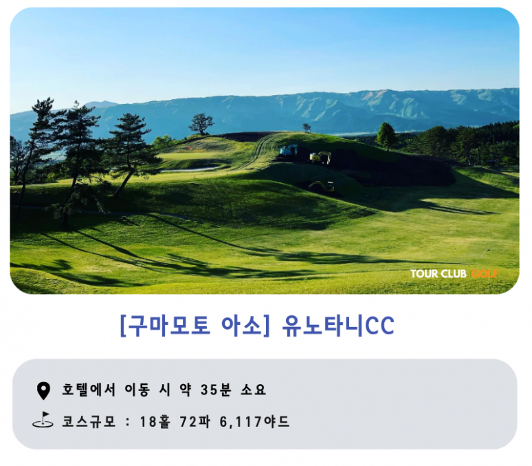 1952년 가을에 개장한 유노타니골프클럽은 60여년 역사를 가진 구마모토현 내에서 가장 오래된 명문이다. 불도저 등 기계를 사용하지 않고 삽과 도구만을 이용한 수작업으로 자연의 지형을 그대로 살려 건축된 수제 골프 코스로 더욱 유명하다. 개장 당시 부지에서 방목이 이루어지고 있었기 때문에 “말과 소의 배설물이나 발자국에 들어간 볼은 벌점 없이 드롭 할 수 있다” 라는 독자적인 로컬 규칙이 있었을 정도로 자연의 지형을 그대로 살렸다. 현재는 방목이 이루어지고 있진 않지만 이후 자연이 만들어내는 변화를 즐기면서 플레이를 할 수 있다는 점이 유노타니 코스의 가장 큰 매력이다. 어느 홀에서든 아소산의 웅장한 모습을 볼 수 있고 자연적인 코스를 그대로 살린 언주레이션을 즐길 수 있다.?