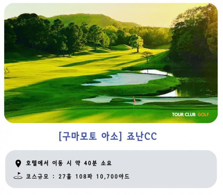 아소지역인 외륜산 둘레를 따라서 아름다운 풍광과 함께 아소 오악중 한곳인 키시마다케의 언저리에 위치한 전형적인 산약형 코스로 이루어져 있 는 골프 코스로서 고스기 리조트 내의 부대시설인 18홀의 리조트 골프 클럽입니다. 생각보다는 스코어가 잘 나오는 코스로 선호도가 높으며, 한 여름에 부킹하기가 쉽지 않은 코스로도 알려져 구마모토현 내 약 42곳의 골프 코스중 중상급 에 들어가는 골프코스로 한국의 골퍼들도 즐겨 찾는 골프장입니다.?