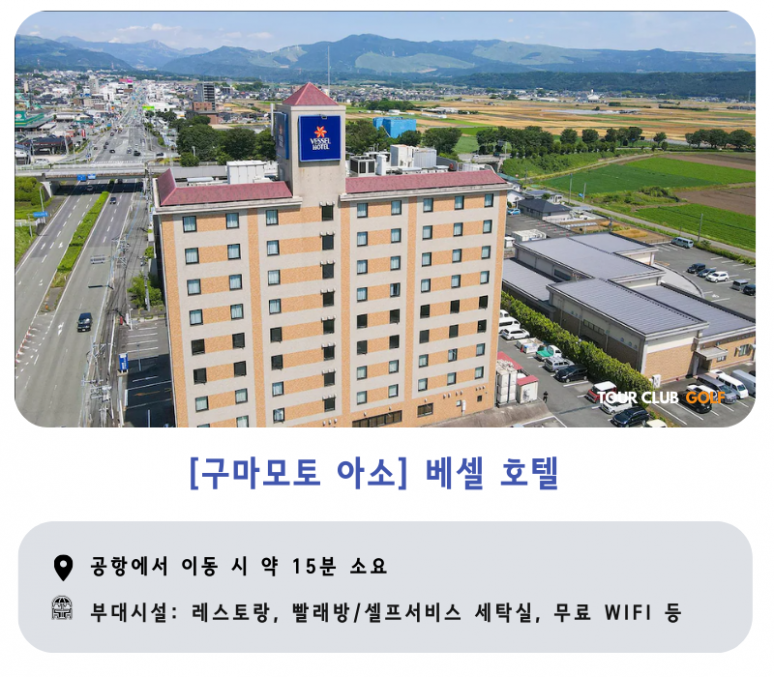 인천 국제공항 출발 구마모토 국제공항 도착 기사 미팅 후 호텔로 이동 호텔 체크인 후 휴식 |