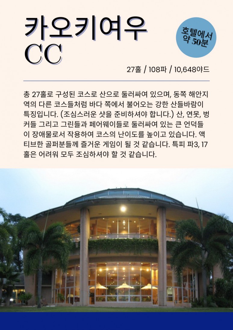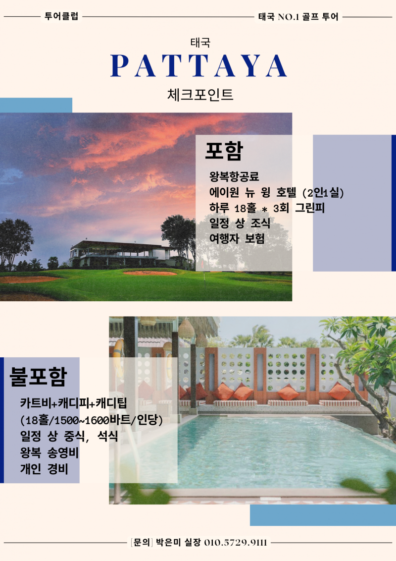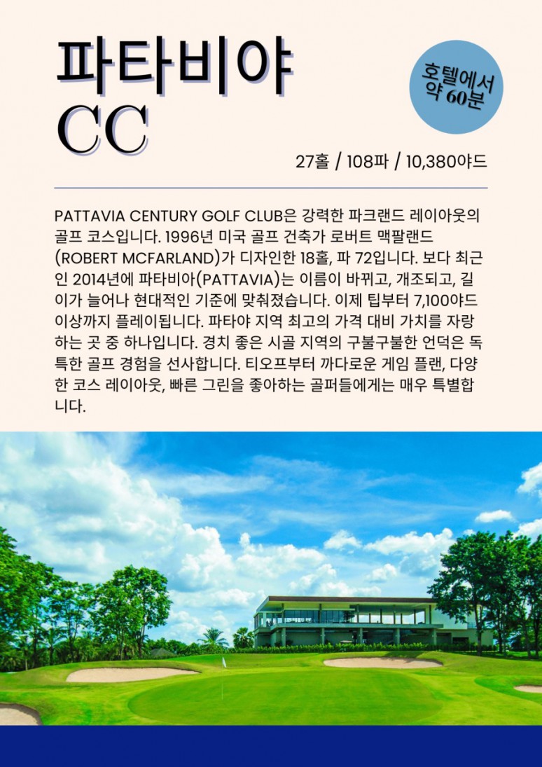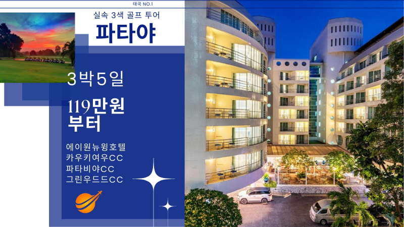 | 파타야 | 전일 | 호텔 조식 후, 골프장으로 이동 파타비아아 CC .그린우드CC.실키오크CC 中 18홀 라운딩 자유일정 및 석식 후, 호텔 투숙 및 휴식 |