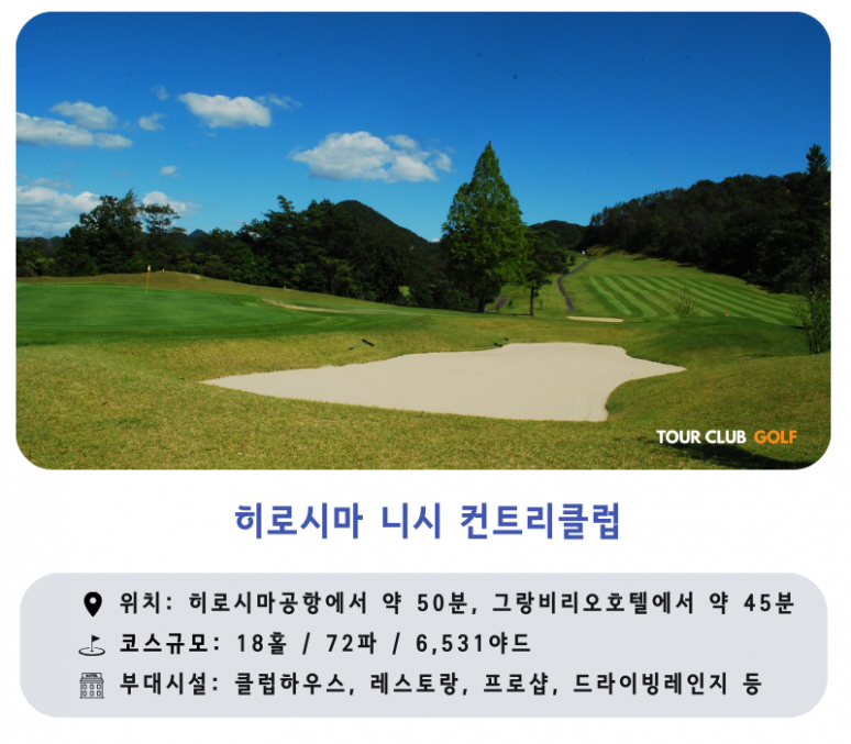- 히로시마니시CC : 명산 미쿠라다케 기슭에 위치하여 명봉의 정기를 듬뿍 받을 수 있는 골프 코스
