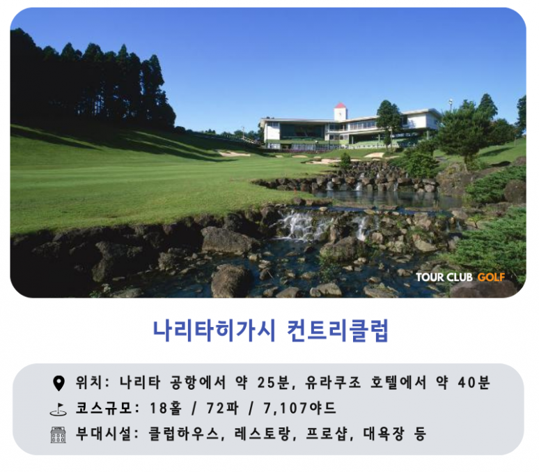 | 나리타 | 호텔 조식 후 골프장으로 이동 (약25~45분) ◆ 골프 18홀 라운드 (노캐디, 셀프 카트 플레이) ㄴ동경국제공항CC/사쿠라노사토CC/나리타히가시CC/코쿠CC/나리타노모리CC 중 1곳 라운드 종료 후 호텔로 이동 호텔 투숙 및 유라쿠조 온천테마파크 체험 |